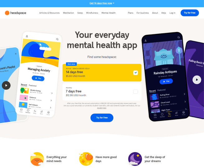 Headspace's mission is to provide every person access to lifelong mental health support. Through the Headspace app, they provide mindfulness tools including meditations, sleepcasts, mindful movement and focus exercises.